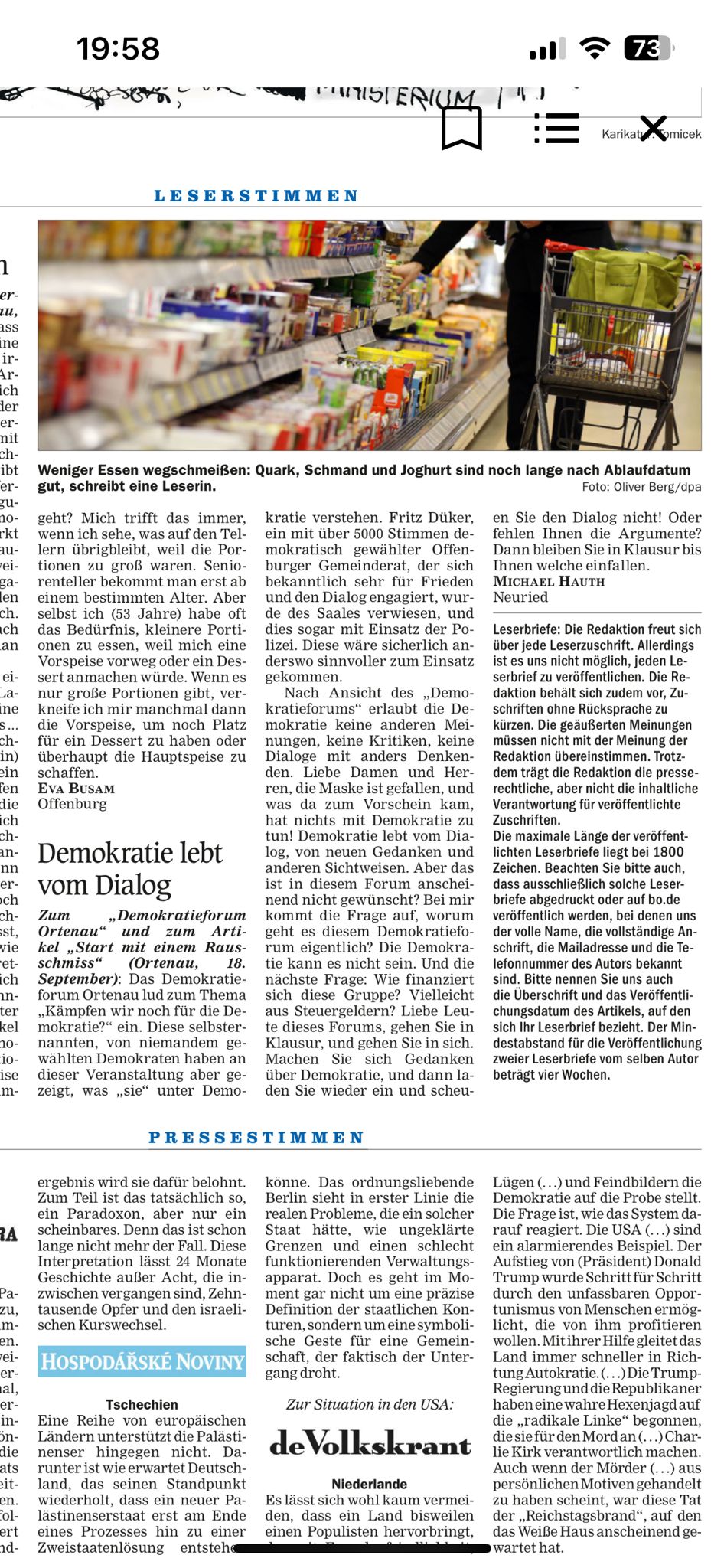 Da sich der Pressespiegel teilt, sein Gesicht zeigt und dazu zu Eindrücken bewegt die jedem Konsumenten von Nachrichten führt, möchte ich auf das eigentliche Thema des Demokratieforum-Ortenau zurück kommen. Es ist nicht der Inhalt der uns aufgetischt wird, sondern die Schlagzeile. Die muss sich verbreiten. Reichweite und Reaktionen scheinen wichtiger als sich für die Demokratie einzusetzen. Unpopuläre Themen gehen unter, finden keine wertige Erwähnung. Das möchte ich hier in kurzen Worten jedoch nicht versäumen.