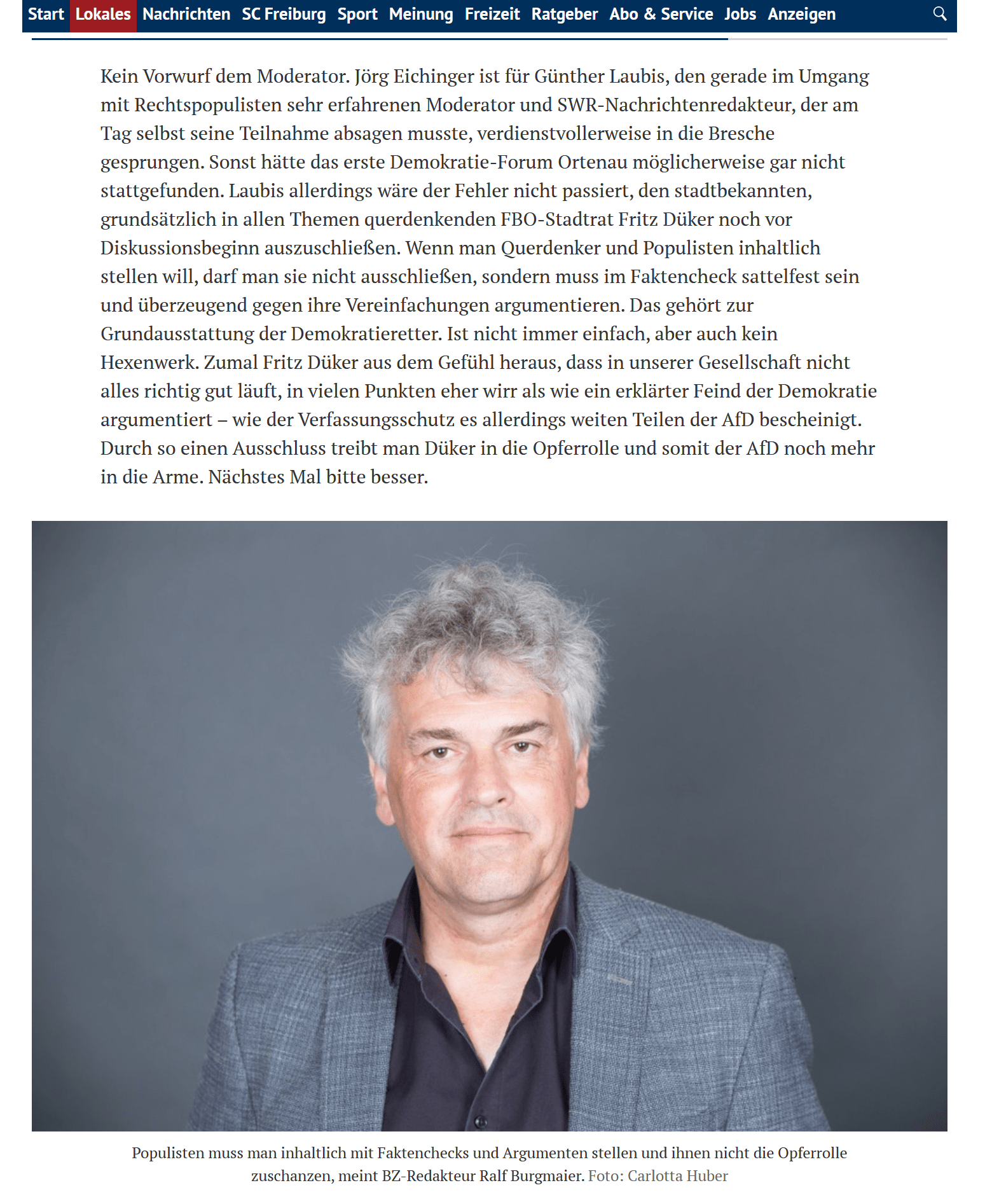 Während hingegen die Badische Zeitung neutral berichtete und auch der Journalist Ralf Burgmaier in seiner Wortmeldung betonte, dass unter dem angekündigten Moderator Günther Laubis ein Rauswurf nicht stattgefunden hätte, denn dieser sei im Gegensatz zu mir ein versierter und mit Populisten erfahrener Moderator.